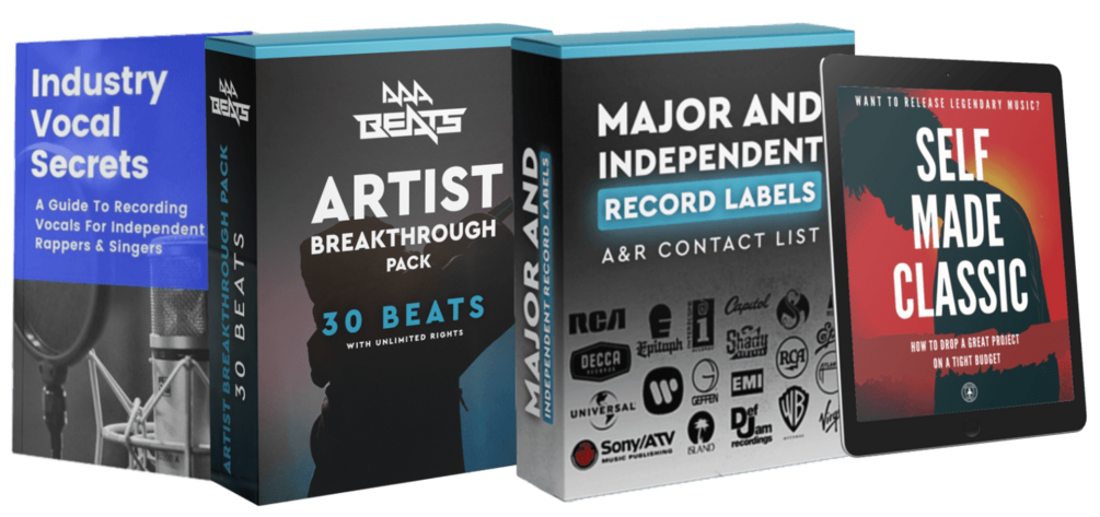 "Artist Breakthrough" Beat Pack Containing 30 Of Our Best Premium Beats (MP3 & WAVs) With UNLIMITED Rights, "Industry Vocal Secrets" Guide, Record Label Contact List and "Self Made Classic" Audiobook